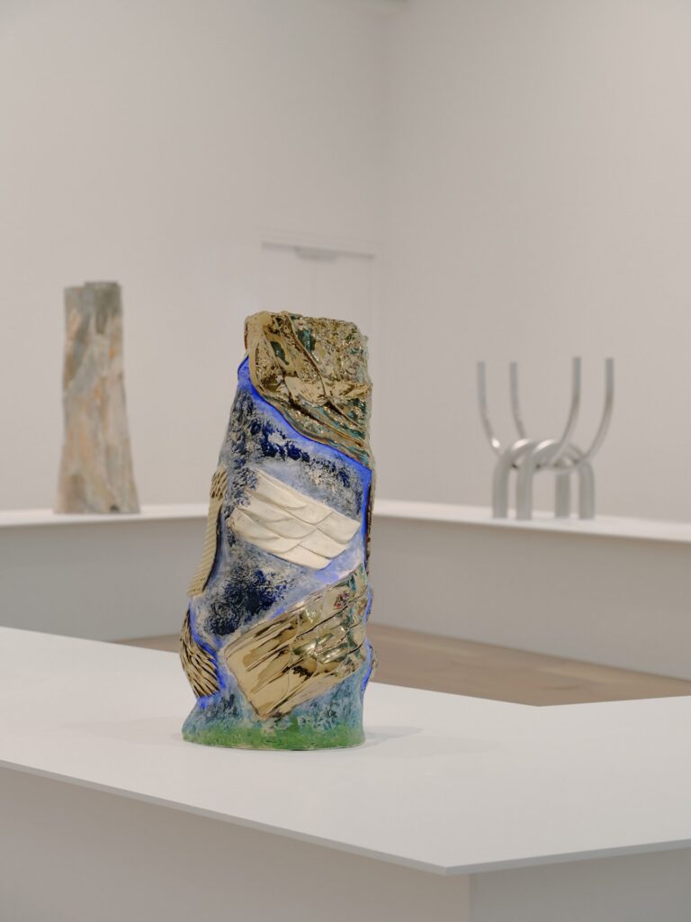 Relic, 2022, is a sculptural ceramic work inspired by archaeological relics. Drawing on the cultural ecologies of lost and stolen artefacts of the Al-Jazira region – the area between the Euphrates and Tigris Rivers, also known as Mesopotamia – Relic is hand-built using earthenware clay, glazes and oxides. Eccentric in form and colour scheme, its curvatures and seemingly fragile shapes are inspired by archaeological figures and decayed architectural sites in the region. Dolation’s largest work to date, Relic continues the artist’s abstract visualisations of the dialogue between the human and non-human, nature, biology and technology.