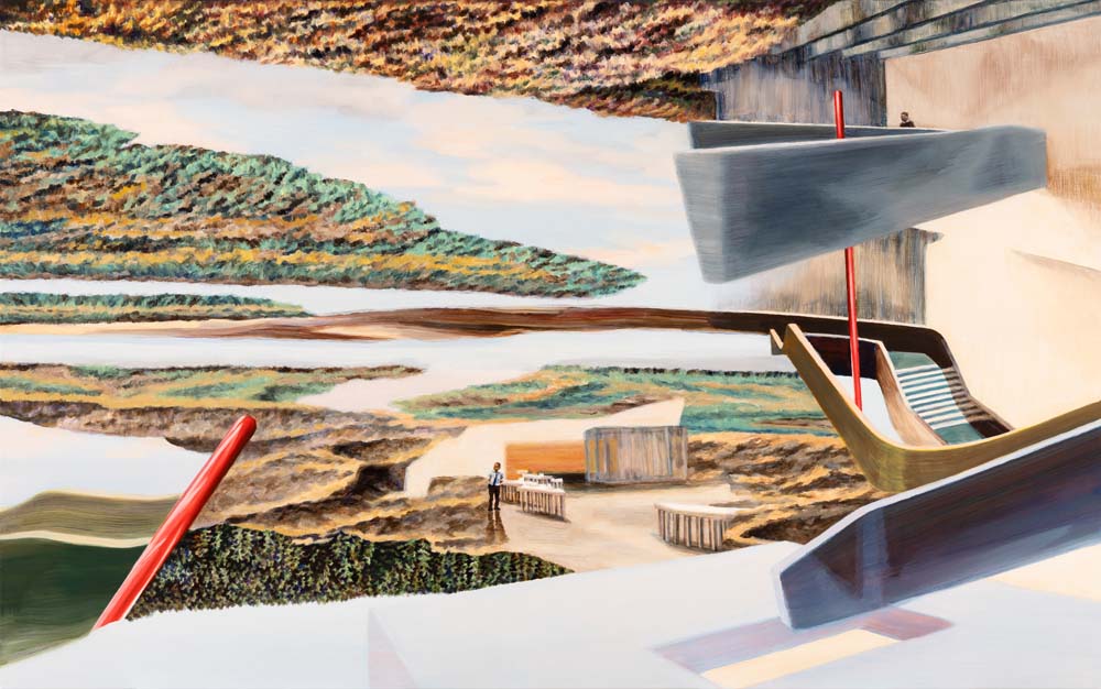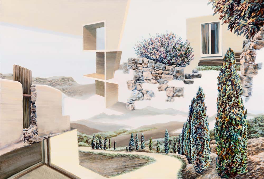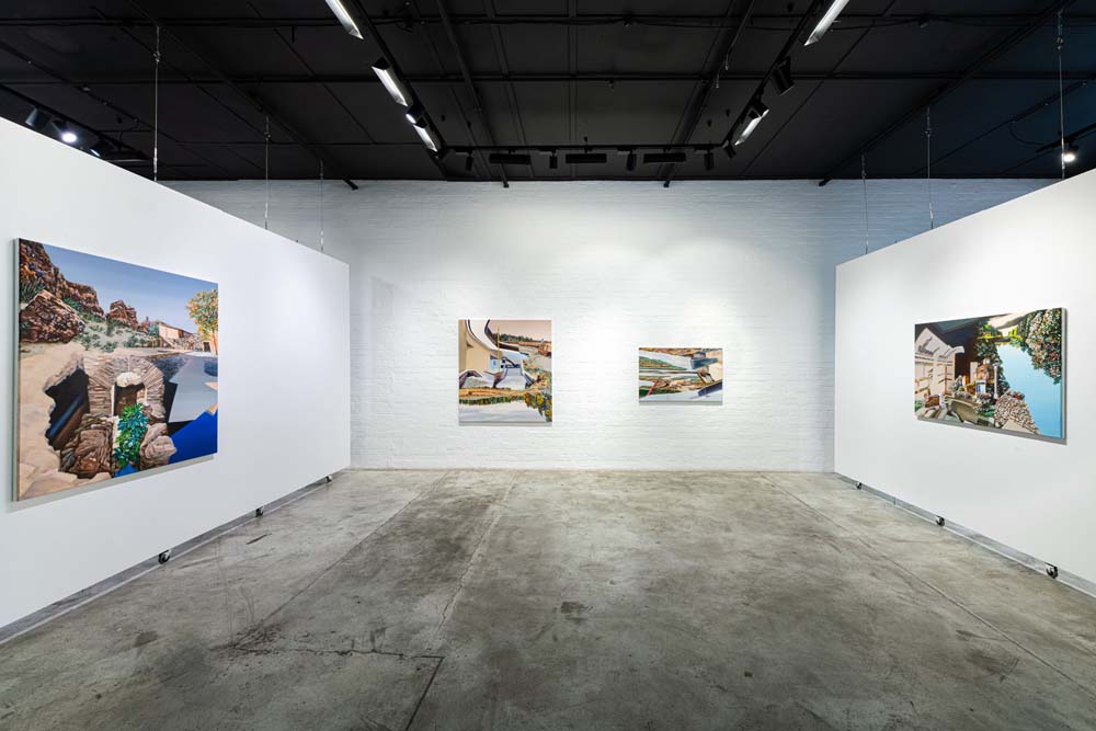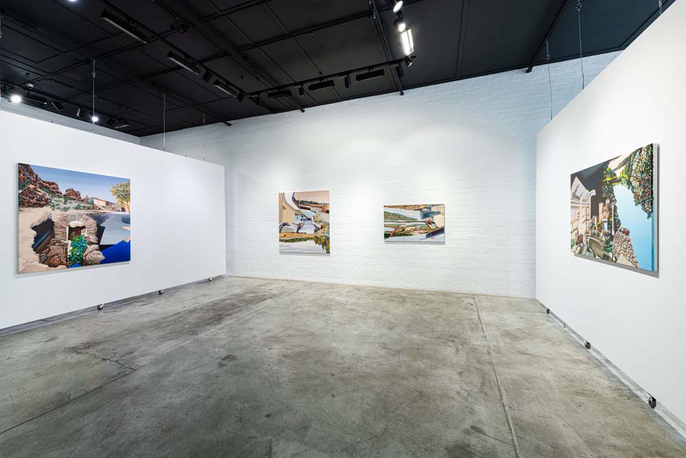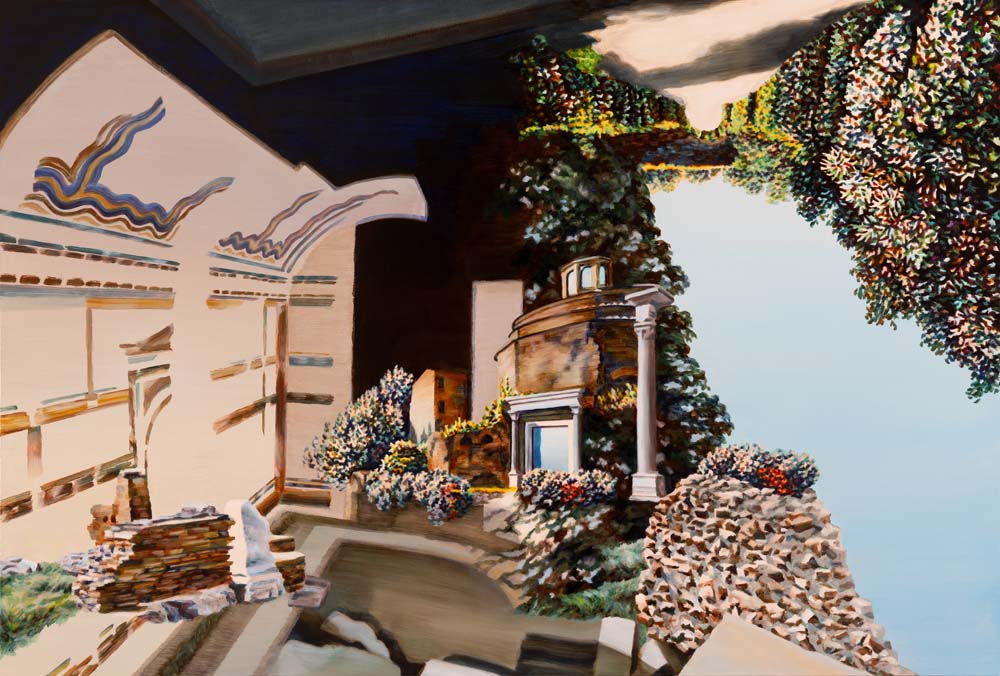 Chin’s practice has long drawn together fragments from disparate places and histories. In From The Ruins, European references extend this trajectory: ancient ruins collide with futuristic structures, while desert landscapes and Tuscan light intermingle with traces of Rome. These works consider how distant events ripple across borders, shaping the interconnected realities of contemporary life.